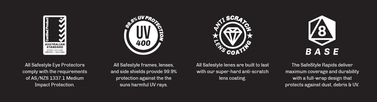 The SafeStyle Rapids are built for those who need maximum coverage and durability. This full-wrap design provides complete protection against dust, debris and UV without blocking peripheral vision.
